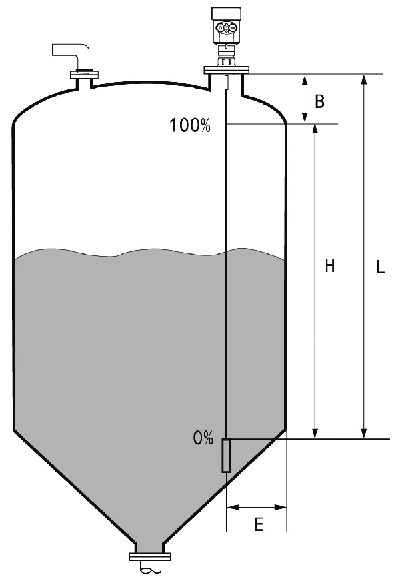 H----測(cè)量范圍 L----空罐距離 B----頂部盲區(qū) E----探頭到罐壁的最小距離